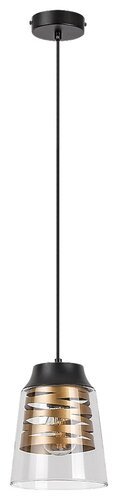 Corpul negru mat construit din metal este complimentat de un abajur transparent de sticlă, care are în interior o decorațiune sub formă de panglică aurie, ce înconjoară sursa luminoasă.