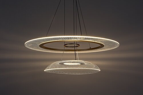 Lampa suspendată Rabalux Zofrael este recomandată celor care caută o lampă sofisticată, cu un aspect unic, pentru camere mai spațioase. Acest candelabru spectaculos este realizat cu un suport din metal de culoare aurie și un abajur din acril transparent. Este alcătuit din două capete de lampă suspendate unul sub celălalt, cel superior fiind plat și de formă disc, iar cel inferior mai mic și de formă umbrelă. Suprafața abajurului are un frumos model gravat, care devine vizibil atunci când lampa este aprinsă. Lampa suspendată poate fi montată pe tavan folosind o bază decorativă rotundă de culoare aurie și cabluri metalice de culoare argintie. Aceasta dispune de o sursă de lumină LED încorporată, care oferă o luminozitate mare, o funcționare eficientă energetic și o durată lungă de viață. Lampa emite o lumină albă caldă. Este ideală pentru living, dining sau dormitor.